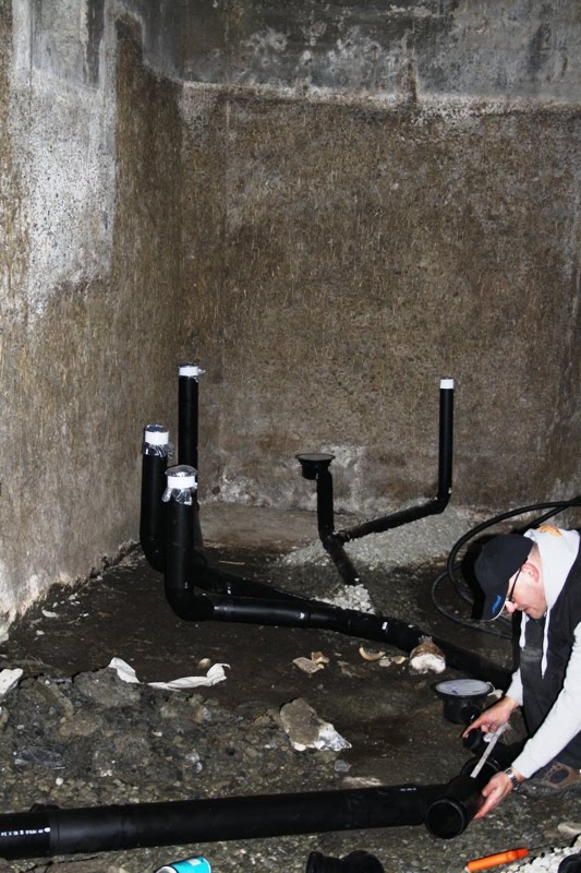Etter at me var ferdige med røyrene var det Skutle sin tur att med å leggja armering og ta den siste finpussen før betongbilen dukka opp med pumpe og laaang slange, tida med trillebårer er forbi. Skutlekarane spratt rundt og la ut betong, målte og nivellerte og på eit par timar var det støypt.Litt spesielt var det at det var den kaldaste vinteren på lenge, støypinga måtte gjerast på dagar med temperaturar mildare enn 10 minus og alt arbeidet gjekk føre seg med tjukke varmedressar, lange ull under og diverse anna varmt – fytterakkaren!