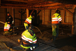 Det første som måtte gjerast var å støypa golv i første høgda. Til dette arbeidet leigde me inn Skutle Betong, eit svært kompetent lite firma som kan dette med betong.Som før beskrive var golva grovplanerte og oppfyllte med pukk. Grovplanert og plant viste seg å vera to ulike begrep så det måtte rettast opp ein del. Golvet i den største salen viste seg å vera umogeleg å retta opp samstundes som ein tok vare på takhøgda så det golvet er lagt med litt helling. Andre stader måtte ein gå laus og grava litt att, denne gongen med hakke og spade. Opprettinga vart gjort med store mengder singel som vart tippa inn låvedøra i ein stor haug før han vart frakta rundt og planert inne i dei ulike romma i løa. Deretter kom røyrleggjarar og elektrikarar på plass og la ned naudsynte røyr og trekkjerøyr før det vart finplanert igjen og kompaktert.