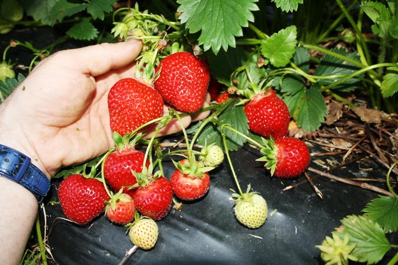 Det er søte tider no, me har akkurat starta å plukka Florence, den seinaste sorten me har. Sesongen så langt har vore litt skjemt av regn, desse bæra er fastare og toler litt meir væta. Og at dei er gode kan nok dei ti jentene på biletet gå god for. Dei kom oppom åkeren her hin dagen og kjøpte seg nokre korger og meinte det var beste bæra dei hadde smakt.