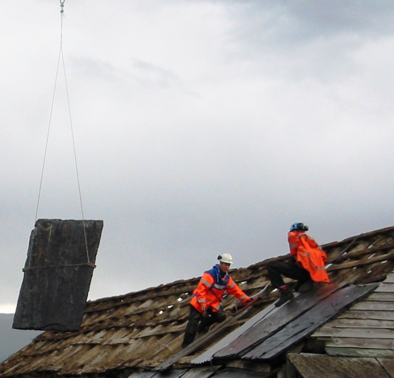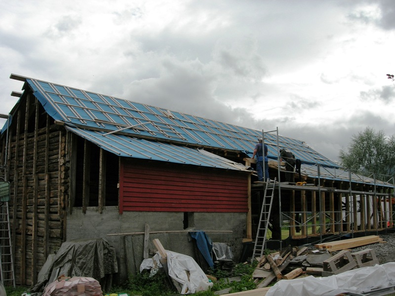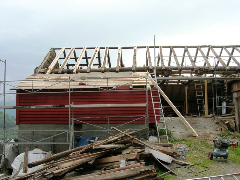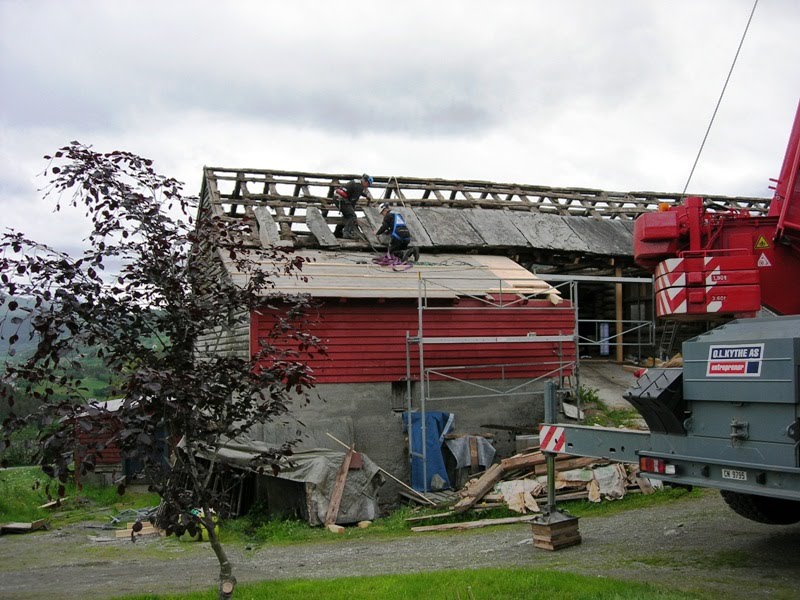 Taket på løa var i ein heller tvilsom forfatning men heldigvis framleis nokonlunde tett. Det skumle var at åkane på sperrene var byrja å rotna så hellene var på sig og kunne eigentleg detta ned kortid som helst. Det er her snakk om heller på 1,5 X 2m som veg mange hundre kg så risikoen ved at dei datt ned var langt over det akseptable. Me brukte Byggmeister David Gjøstein som entreprenør, han og firmaet er ekspertar på restaurering av gamle bygg, dessutan hadde me veldig positive røynsler med David då han som pur ung snikkar bygde huset vårt, så valet var lett. Mobilkran frå O.L. Kythe vart innleigd og taket for av i ein fart. Hellene vart fint stabla opp og merkte for dei skulle opp att seinare.