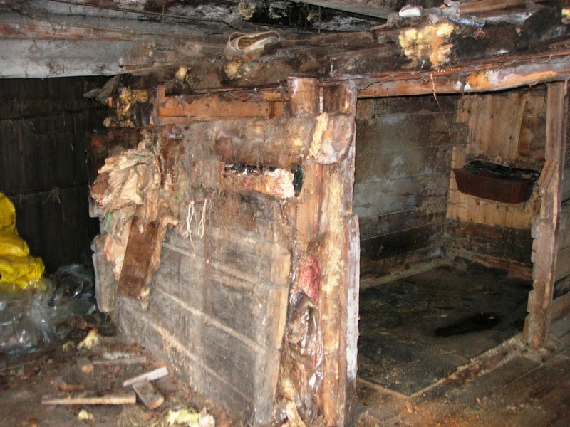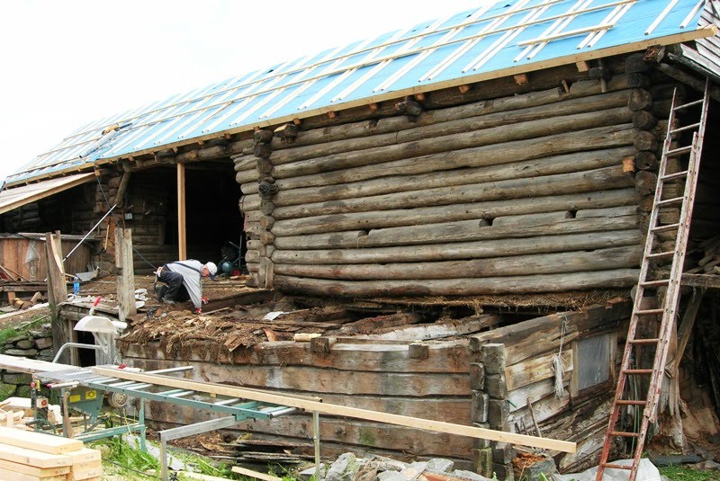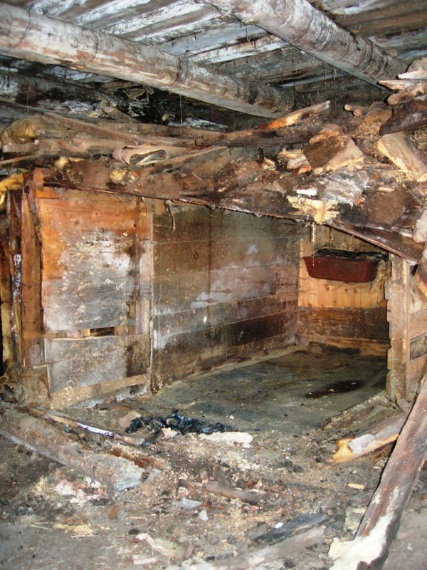 Etter at takhellene var tekne av kunne me riva ned svolene og gå i gang med å tømma ut alt som hadde lagra seg opp i løpet av 150 år. Det var litt av ein jobb. Først vart alt laust bore ut og sortert, det meste kom i kast haugen men eitt og anna var verdt å behalda. Så kom den trasigaste jobben; riving og utbering av smalfloren og stallen. Som de ser av bileta så var desse opplafta inne i løa men utan å vera ein del av konstruksjonen av løa. Dei var begge godt rotne og fulle med støv, drit og allslags uhumskheiter. Rivinga gjekk føre seg ved å saga opp tømro med motorsag (fann mykje spikar) og bera ut delene etterpå. Akkurat når me heldt på med det såg eg litt mørkt på heila greio, det verka som om det var langt fram. Eg må sei at det endra seg inne i løa når desse kassene var vekke, du verden så god plass det brått vart.