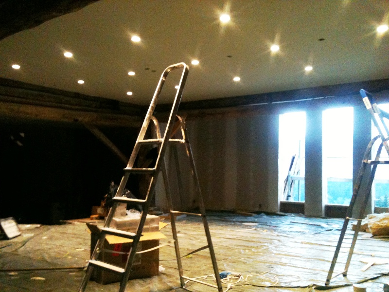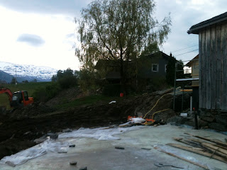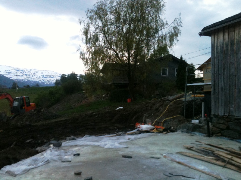 Fullt køyr både ute og inne for tida. Det byrjar sakte men sikkert å verta ferdig. For tida driv Skutle betong og legg skifer på golva, verkeleg fint vert det. Gjøstein driv og finpussar dei siste detaljane inne og skal snart kle og leggja tak på ventilasjonshuset. Vedaa røyrleggjar var innom i dag og skrudde opp litt røyrstussar og merkte opp for golvvarmen i andre høgda. Arnstein frå Horvei Elektro monterte spotlampar i taket, det vart veldig fint når dei lyste. Og ute er Skutle Betong i gang med å grovplanera hagen – og me? me driv og målar tak og vegger.