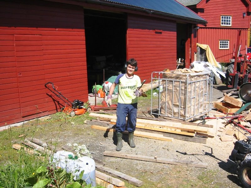 Erlend, Ali og Jon var gode hjelparar i denne tida, det var ikkje ratt få storsekker med raskaved me pakka og stua vekk. Me har fyrt med gamlaløo kvar vinter sidan, men ser no omsider slutten på den veden.