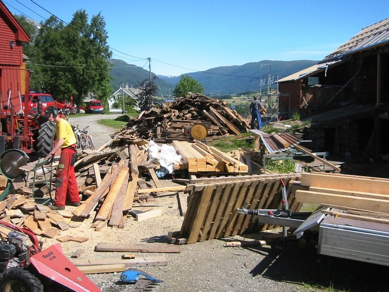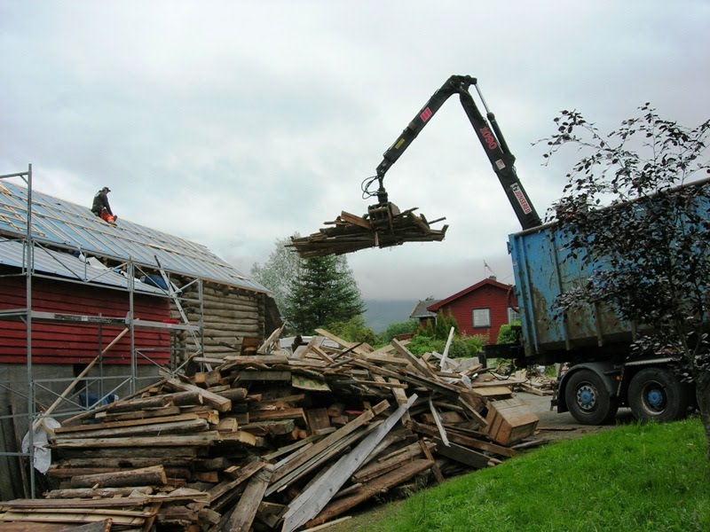 All denne rive, bære og byggeaktiviteten på ein gong fyllte sjølvsagt opp tunet med rus, rask og treavfall på rekordtid.Alt dette måtte så sjølvsagt sorterast og fjernast. Alt som var reint nok kappa me opp til ved, men innsausa vegger frå stall og smalflor ville me ikkje ha i hus. Det hagla med velmeinande gode råd som å brenna det opp eller grava det ned men me landa heldigvis på løysinga med å levera det som treavfall på deponiet til IHM. Veldig greitt då – ein containerbil med tømmerkran svingar innom tunet og pakkar containeren full og vekk er det. Vel, det vart ein god del meir enn ein container så det var godt me slapp å slita med det sjølve meir enn me alt hadde gjort. Eg meiner å hugsa at me leverte i overkant av 200m3 treavfall.