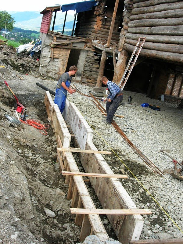 Etter at me var ferdige å dura på med maskin innvends var det på tide og byggja oppatt svolene som skulle vera ytrevegger i løa. Opp mot tunet måtte me støypa ein vegg opp i høgde med tunet. Sidan det var ikkje akkurat overflod av pengar leigde me inn to polske frå eit lokalt formidlingsbyrå til dette. Om det vart billegare veit eg knapt sidan desse to ikkje visste så mykje meir om forskaling enn eg gjorde. Men forskalinga kom no opp til slutt. Då me skulle støypa viste det seg at det nok var visse svakheiter i forma for den heldt på å rivna! Heldigvis gjekk det bra.Svolene på dei to andre sidene av løa var ikkje heilt nedrivne, deler av reisverket og nokre sperrer sto att. Her vart det supplert med reisverk og sperrer.