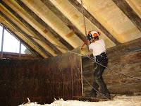 Den vetle tresiloen var skikkeleg solid bygd, så det var litt av ein jobb å få han vekk. Her kom røynslene med arbeid i tau godt til nytte, det er ikkje moro å stå i ein stige med brekkjern utan å vera sikra. Brekkjern var forresten ikkje nok, eit skikkeleg langt skogsbrytejern måtte til. Heldigvis var ikkje denne siloen impregnert så han vart til god ved.