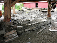 Alle stavane, eller søylene vart sjekka om dei sto på trygg grunn. To sto på trygg fjellgrunn, ei sto på ei stor helle som kvilte på grunnmuren og to sto på silt. Dei tre siste var murte opp i naturstein, desse sto også på silt. Søylene på silt fekk ny fot av solid skifermurstein, dei andre sto som dei var.