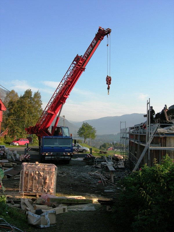 Også på svolene vart det lagt sutak av rupanel med duk oppå. Så vart det lagt rekter og lekter og pallane med skifer vart heiste opp på taket og lagt. Det var litt putl sidan det var meir som valma no i hjørnane så der måtte det leggjast forsterkingar under sløysane.