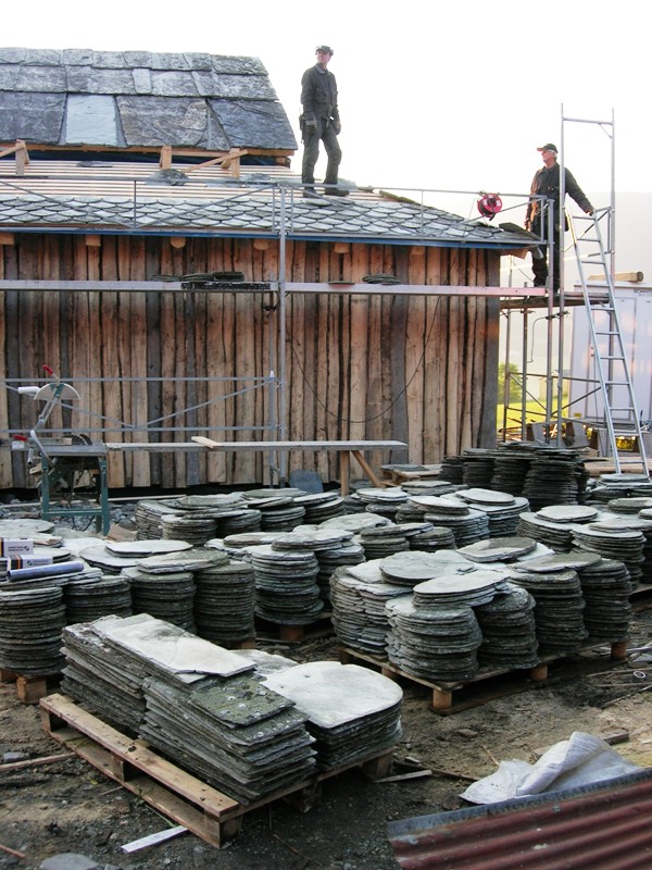 Etter at svolene vel var oppattbygde var det på tide med taket. Snikkarane til Byggm. D. Gjøstein hadde allereie drive ei stund med hovudtaket. Som tidlegare fortalt vert dei store hellene brukt oppatt. Til svolene hadde me ikkje nok store heller samt at ein del av dei som var der frå før var av svært dårleg kvalitet så me valde å bruka 12 X 18 dråpelapp av Vossaskifer. Litt intens leiting på Finn.no gav ikkje så mykje resultat, den skiferen me såg på der var ofte av dårleg kvalitet eller for langt vekke.