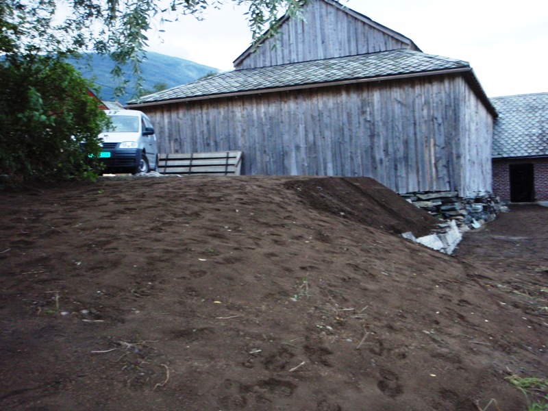 Ei snedde gravemaskin og ein flink førar gjekk laus i tre dagar og resultatet vart ei fint tilpasa fylling på nedsida som vart dekt med matjord. På vestsida vart det pukka opp ein liten parkeringsplass som vart dekt med grus og på austsida av låvebrua, der det gamle steinlageret som var silopress på støypesiloen, vart det laga til med fin singel og grove heller så det vart ein fin uteplass. Deretter vart det sådd og planta og vips hadde me ein fin stor hage og over dobbeltså mykje plen som skulle klippast.