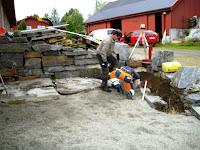 Under restaureringa av løa fann me mange tjukke, store heller i golv og låvebru. Desse fekk me god bruk for då me pussa opp rundt løa sidan Jorunn såg at dei ville passa fint som golv på ein uteplass der steinen til støypesiloen hadde lege. Jordmassane vart grevne ut og det vart fyllt inn att grov pukk og eit lag med fin singel på toppen. Oppå der vart så hellene lagde. Det vart eit heller grovt golv men vil nok fungera heilt fint. På kanten ut mot tunet lagde me til eit bed der det vart planta stauder og sett ned ei hengepil. Oppå kanten var det allereie sett opp eit par stabbesteinar for å sikra at ingen køyrde utom kanten.