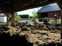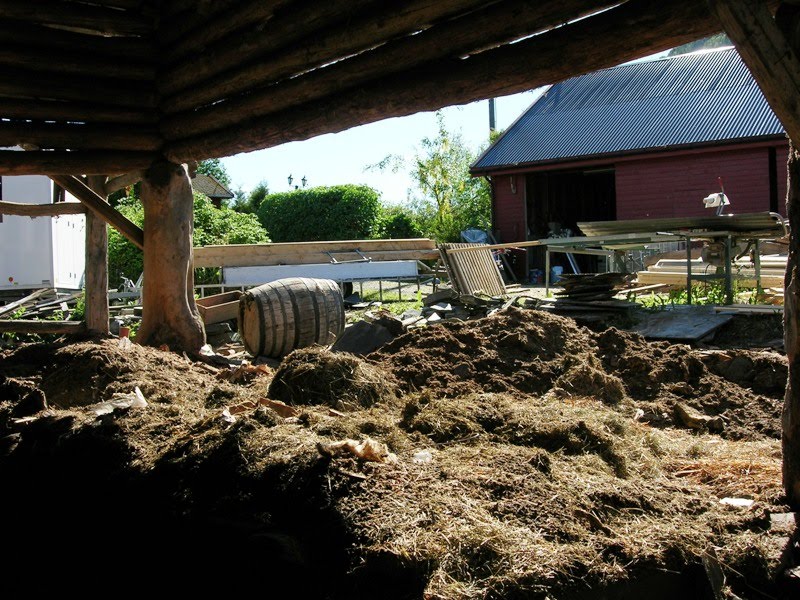 Etter at alt som kunne rivast var rive og utbore var det tid for å fjerna 150 år med drit. Heldigvis var det nå plass til ei lita gravemaskin inne i løa. Denne kunne lessa opp smalamøk i hengaren som eg køyrde ut på bakkane, resten eller mesteparten av det som var der inne var bortimot ein halvmeter tjukt lag av stein, jord og anna før ein kom ned på fjell eller silt.